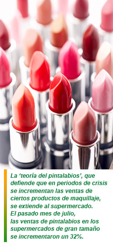 La 'teoría del pintalabios', que defiende que en periodos de crisis se incrementan las ventas de ciertos productos de maquillaje, se extiende al supermercado. El pasado mes de julio, las ventas de pintalabios en los supermercados de gran tamaño se incrementaron un 32%. "Aunque las ventas de maquillaje en el supermercado todavía son muy pequeñas, es una categoría que crece mucho y con un gran recorrido", apunta Eva Vila de Symphomyiri. Otro producto cuyas ventas se han disparado son las cremas solares y los bronceadores, cuya facturación en supermercado creció un 45% el pasado mes de julio. "Este dato responde al incremento del turismo, que este año ha funcionado muy bien", asegura Vila. El incremento se produce en los supermercados porque turistas franceses, alemanes y británicos están acostumbrados a comprar este tipo de productos en establecimientos de gran consumo.
