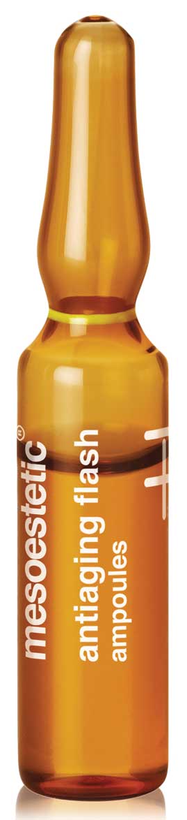 Ampollas antienvejecimiento de efecto tensor inmediato. Tratamiento intensivo que proporciona frescura, hidratación y un efecto lifting al instante. Las antiaging flash ampoules de mesoestetic son la solución para aportar luminosidad instantánea a la piel, para esos momentos en los que necesitas un efecto flash.