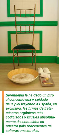 Diseñado por el interiorista Luis García Fraile, Serendipia es un espacio de estética fresca y vanguardista desprovisto de aparatología que ofrece tratamientos artesanales, productos orgánicos inéditos en España y protocolos adaptados a los tiempos de cada cliente. Y todo ello apto para presupuestos de hoy.