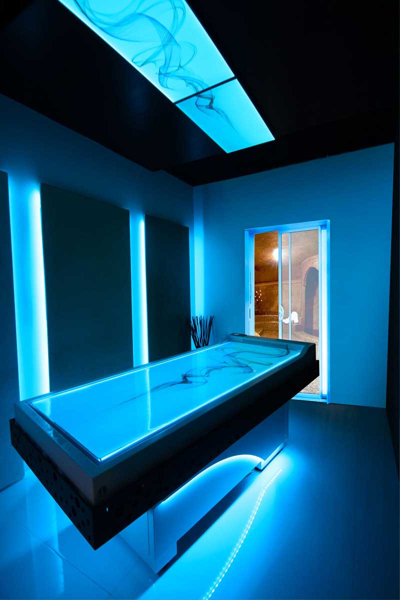 En Lympha, la losa de mármol es reemplazada por una superficie de plexiglás que es calentable, retroiluminada y tiene un gráfico personalizable. La fascinante hoja de agua que proviene de la parte superior de la cama puede ser de agua fría y caliente alternativa, y completa el masaje, dejando la sensación en el cuerpo de una caricia. Un desafío maravilloso que abre las puertas a un mundo inexplorado donde la cultura y el bienestar interactúan en el camino hacia éxito.