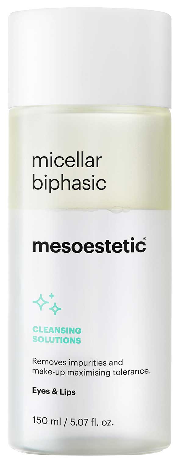 micellar biphasic es un nuevo desmaquillante bifásico de alta tolerancia para ojos y labios. Combina micelas con un aceite vegetal rico en omega 6 para retirar de forma suave la suciedad y maquillaje con una sola pasada, incluso el maquillaje water proof. Elimina hasta la última partícula, además de dejar una agradable sensación de suavidad en el contorno ocular, sin residuo graso.