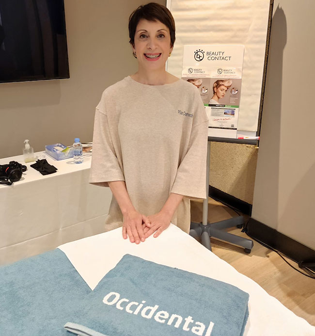 Pilar Muñoz Correcher demostró en directo la técnica del Masaje Mioxigenante, el el taller que protagonizó para los asistentes en Beauty Contact País Vasco-Bilbao, ante un nutrido grupo de profesionales de la belleza y la salud.