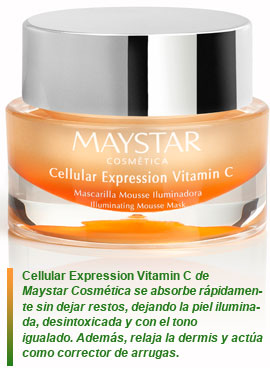 Cellular Expression Vitamin C de Maystar Cosmética es una mascarilla con textura de mousse y aromas cítricos. Su contenido en vitamina C provoca un efecto regenerador de acción intensiva, con alto poder hidratante que favorece la producción natural de colágeno en la piel. Se absorbe rápidamente sin dejar restos, dejando la piel iluminada, desintoxicada y con el tono igualado. Además, relaja la dermis y actúa como corrector de arrugas, retrasando el envejecimiento prematuro de la piel.
