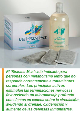El Sistema Mes está indicado para personas con metabolismo lento que no responde correctamente a tratamientos corporales. Los principios activos estimulan las terminaciones nerviosas favoreciendo un micromasaje profundo con efectos en cadena sobre la circulación ayudando al drenaje, oxigenación y aumento de las defensas inmunitarias.