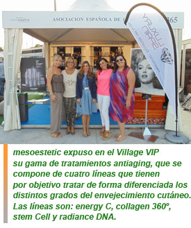 mesoestetic expuso en el Village VIP su gama de tratamientos antiaging, que se compone de cuatro líneas que tienen por objetivo tratar de forma diferenciada los distintos grados del envejecimiento cutáneo. Las líneas son: energy C, collagen 360º, stem Cell y radiance DNA.