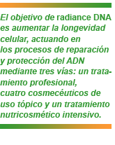 radiance DNA es un tratamiento antiedad global basado en la reparación y protección del ADN y la sincronización del reloj biológico celular, cuyo objetivo es aumentar la longevidad celular, actuando en los procesos de reparación y protección del ADN mediante tres vías: un tratamiento profesional, cuatro cosmecéuticos de uso tópico y un tratamiento nutricosmético intensivo.