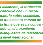 Finalmente, la formación concluyó con un recordatorio sobre cosmelan, el tratamiento estrella de la firma que se ha convertido en el tratamiento blanqueante de referencia a nivel internacional.
