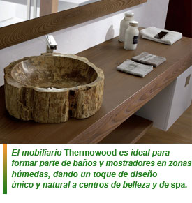Estas características hacen del mobiliario Thermowood el ideal para formar parte de baños y mostradores en zonas húmedas, dando un toque de diseño único y natural a centros de belleza y de spa.
