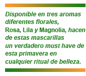 Disponible en tres aromas diferentes florales, Rosa, Lila y Magnolia, hacen de estas mascarillas un verdadero must have de esta primavera en cualquier ritual de belleza.