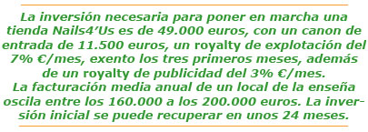 En definitiva, esta marca internacional que se creó en el año 2000 tras un análisis de la importancia que tenía el cuidado de las manos en la mujer actual en muchos mercados, ha conseguido mantener un crecimiento continuado a pesar del panorama económico generalizado. Por eso los planes de expansión de Nails 4'Us para este recién estrenado año 2011 contemplan establecerse en aquellas provincias a las que todavía no ha llegado y seguir expandiéndose a nivel internacional.