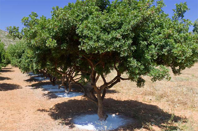 El lentisco o lentisco (Pistacia lentiscus) es un arbusto de hoja perenne que crece en suelos áridos, rocosos y pobres. Los lentiscos son vegetación típica de tipo maqui que se encuentra en los países mediterráneos. Sin embargo, solo los lentiscos del sur de Quíos dan la resina típica cuando se raya la corteza. Esto se debe probablemente al suelo y a las condiciones climáticas especialmente cálidas y secas y explica por qué la producción de masilla en Chios recibe una denominación de origen protegida (DOP).