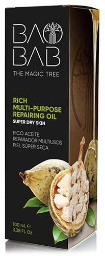 Baobab Aceite Reparador Multiusos. Se presenta en envase de 100 mililitros. Se recomienda su aplicación después de la ducha en cara, cuello y escote. Para su uso capilar es preciso dosificar una pequeña cantidad en la yema de los dedos y aplicarlo en las puntas del pelo o directamente en el cuero cabelludo.