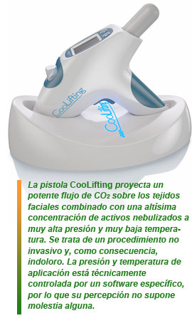 La pistola CooLifting proyecta un potente flujo de CO2 sobre los tejidos faciales combinado con una altísima concentración de activos nebulizados a muy alta presión y muy baja temperatura. Se trata de un procedimiento no invasivo y, como consecuencia, indoloro. La presión y temperatura de aplicación está técnicamente controlada por un software específico, por lo que su percepción no supone molestia alguna.