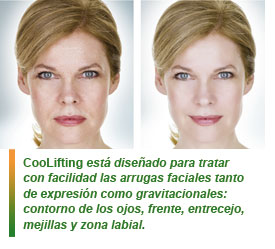CooLifting está diseñado para tratar con facilidad las arrugas faciales tanto de expresión como gravitacionales: contorno de los ojos, frente, entrecejo, mejillas y zona labial.