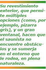Con un exquisito diseño personalizable, totalmente funcional y de vanguardia, esta sauna exterior nos traslada a un mundo de sensaciones sin precedentes. Su revestimiento exterior, que permite múltiples opciones (como, por ejemplo, pizarra gris), y un gran ventanal, hacen que el saunista no encuentre obstáculos y se sumerja en el entorno que le rodea, en plena naturaleza. En su interior, las nuevas saunas de exterior Freixanet conservan todo el calor de las saunas nórdicas, construidas con madera de abeto o hemlock. Además, nos dan la posibilidad de adaptar la cabina con una presauna, porche o ducha, opciones que la harán aún más acogedora y atractiva.
