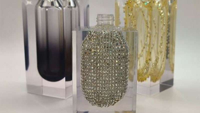 Showcase también ofrece posibilidades de personalización mediante la encapsulación de tela, perlas o lentejuelas, dice Pochet. Puede utilizarse tanto para productos cosméticos como para fragancias. La porción de Surlyn es fabricada por un socio.