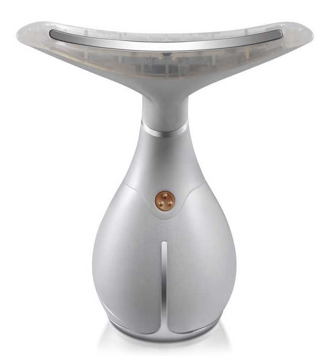 El dispositivo funciona a través de una tecnología de vibración inteligente para relajar los músculos del cuello y ayudar a apuntalar las áreas de la piel envejecida o flácida, eliminando las líneas finas, logrando una piel más firme y suave alrededor del cuello, la nuca y los hombros.