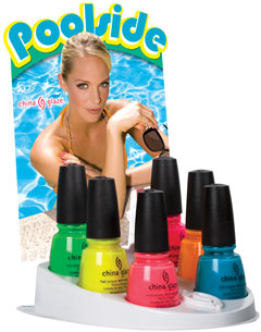 China Glaze lanza la colección de esmaltes para el verano Poolside. Siguiendo las tendencias de la moda, la marca presenta 6 colores flúo, ideales para las noches locas del verano, para la piscina o playa y para la gente joven. Son resistentes, llamativos, de alta calidad y duración. Quedan muy bonitos con una capa de top coat encima.