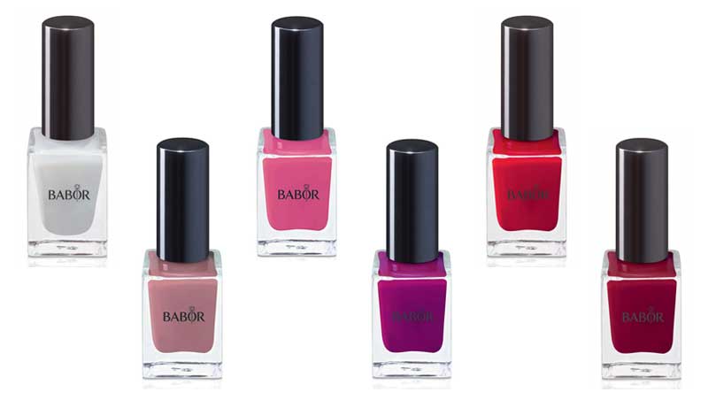 Babor cuenta con una amplia gama de colores de esmaltes para realizar las manicuras y pedicuras más trendy del momento. Estos esmaltes de uñas, aptos para veganas y 100% naturales, cuentan con un amplio abanico de tonos con efectos diferentes. Destacando la línea específica de lacas para tratamientos multifunción, que refuerza y trata la uña con minerales, además de utilizarse como laca base, sobre laca, sellador, reforzador de uñas o para refrescar el brillo del color, truco este último con el que consigues que el esmalte dure mucho más.