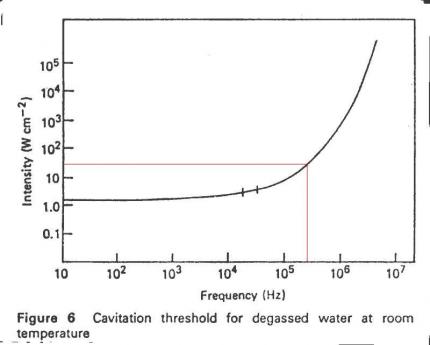 Por otro lado, en la siguiente tabla se puede apreciar que para alcanzar el umbral de cavitación inercial (implosión de burbujas) con un equipo de 400 Khz (5 x 10^5 Hz) la densidad de potencia necesaria sería aproximadamente de 45 w/cm^2. Algo impensable para su aplicabilidad con fines estéticos. Saludos