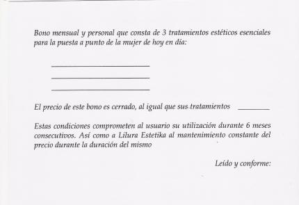 El bono ofrece 3 servicios al mes y hay diferentes bonos para elegir. La clienta paga cada mes el importe de su bono y durante ese mes se hace los 3 servicios. En algunos bonos tiene tratamietos para elegir. Por ejemplo hay uno que: