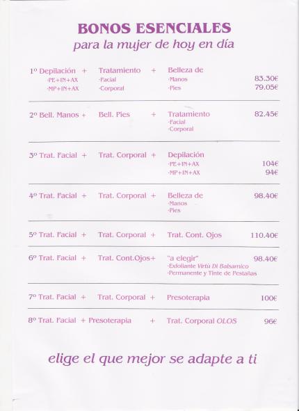 Por lo del precio del bono sumo los tratamientos y les hago un 15 o un 20 de descuesto. Claro, al ser un bono se paga de golpe al mes.