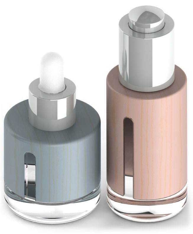 La diferencia con otros droppers actuales radica en que la nueva gama los emplea para cubrir la botella de 30 ml en lugar de cubrir el tapón o el cuello. La funda está realizada en aluminio pulido o madera procedente de bosques sostenibles, y cubre la botella y tiene una ventana que deja ver su interior.