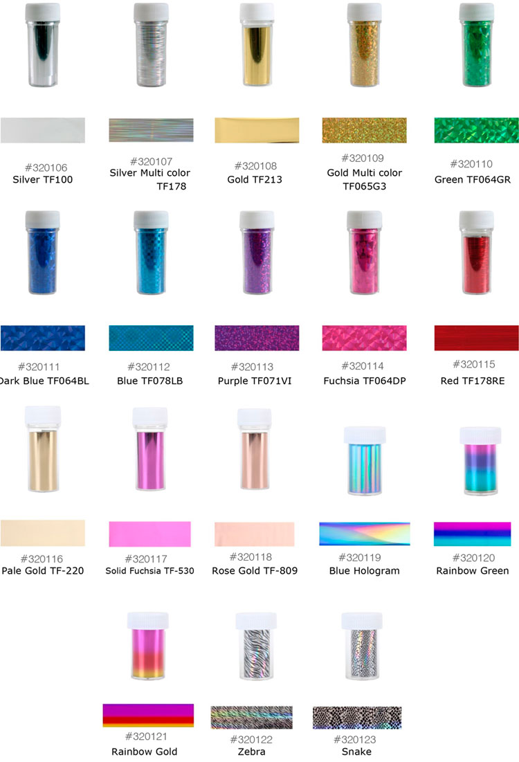 Las Transfer Foils se emplean en cualquier técnica de uñas (acrílicas, gel y esmaltadas). Atrévete a decorar las uñas con estas láminas, disponibles en 18 colores y diseños diferentes. Sin duda, la última tendencia en decoración de uñas.