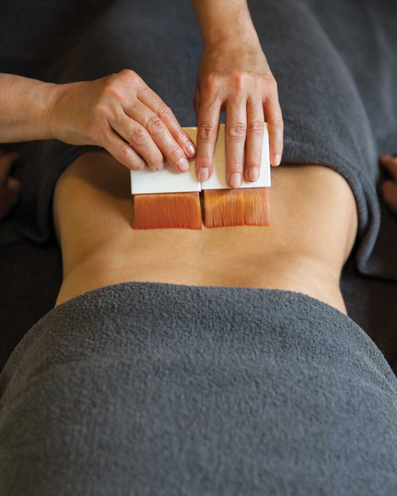 Se realizan amplios movimientos creados con pinceles particulares, anchos y planos, suaves como las plumas, facilitan una relajación total gracias a las fibras nerviosas más superficiales. El toque amable y el uso alternado y combinado de estos dos pinceles muy suaves estimulan de hecho las fibras C, particulares fibras nerviosas identificadas recientemente y valoradas por su acción relajante para la mente.