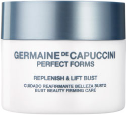 Germaine de Capuccini, a través de la tecnología más innovadora, diseña un tratamiento específico para lucir unos senos voluminosos, tersos, suaves y turgentes: Replenish & Lift Bust Cuidado Reafirmante Belleza Busto, de la línea Perfect Forms, un cuidado de belleza para los senos de textura sedosa y fundente que incluye en su fórmula el activo multi-funcional 3-Action Bust Complex, el cual concentra tres acciones: