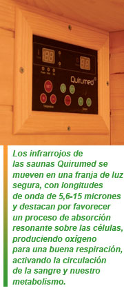Concretamente, los infrarrojos de las saunas Quirumed se mueven en una franja de luz segura, con longitudes de onda de 5,6-15 micrones y destacan por favorecer un proceso de absorción resonante sobre las células, produciendo oxígeno para una buena respiración, activando la circulación de la sangre y nuestro metabolismo.
