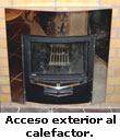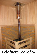 El calefactor de esta sauna, característica distintiva de la misma, no es eléctrico sino de leña. Pertenece al grupo de estufas de leña de funcionamiento continuo en el que los humos de la combustión no pasan a través de las piedras. La carga de madera y la eliminación de cenizas se realiza desde el exterior de la sauna, efectuándose la evacuación de humos a través de una chimenea que conduce los mismos hasta el exterior sin entrar nunca en la sauna. Alrededor del calefactor, las paredes de la sauna no son de madera sino construidas en mampostería refractaria.