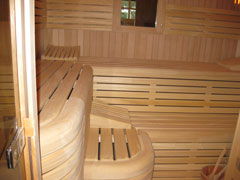 Como ejemplo de una sauna especial presentamos un modelo de gran lujo, construido en madera de hemlock, con puerta especial de 0,80 m de anchura, totalmente de vidrio y ventana practicable en la pared posterior. Sus bancos están acabados formando olas y con sus cantos totalmente redondeados.