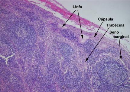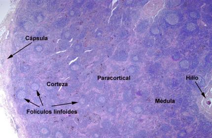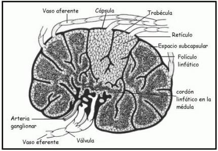 tiene una corteza externa con una cápsula de tejido conjuntivo que lo rodea, y una zona medular. de la cápsula emergen trabéculas medias , que dividen al ganglio internamente. En las imágenes 2,3,6,7.