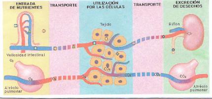 Mediante los dos sistemas circulatorios, tenemos por un lado el corto que va desde el corazón a los pulmones, respiramos oxigeno, que será utilizado por las células para oxigenarse, y luego para eliminar el dioxido de carbono por los alveólos pulmonares.