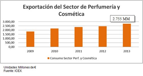 Según los datos recogidos por la UN Comtrade (ONU), España ocupa el sexto puesto como exportador mundial de productos de perfumería y cosmética, el quinto dentro del mercado de la Unión Europea. Esta realidad se ha confirmado con las cifras reveladas en 2013, con unas ventas al exterior que han alcanzado los 2.755 millones de euros, un 11,8% más que el año anterior, por encima de otros sectores emblemáticos como el vino o el aceite y superando las previsiones más optimistas.