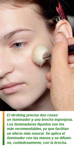 La clave del strobing consiste en agregar más luz y brillo al rostro, pero sin que el resultado sea obvio. El iluminador se extiende en los pómulos, el hueso frontal, el centro de la frente, la nariz y la barbilla. Esta técnica también destaca las facciones pero el resultado es más fresco y natural que con elcontouring.