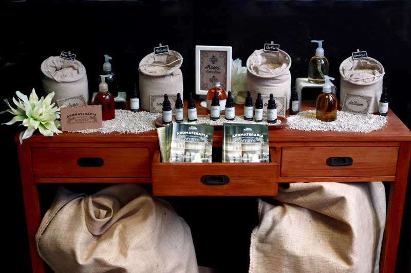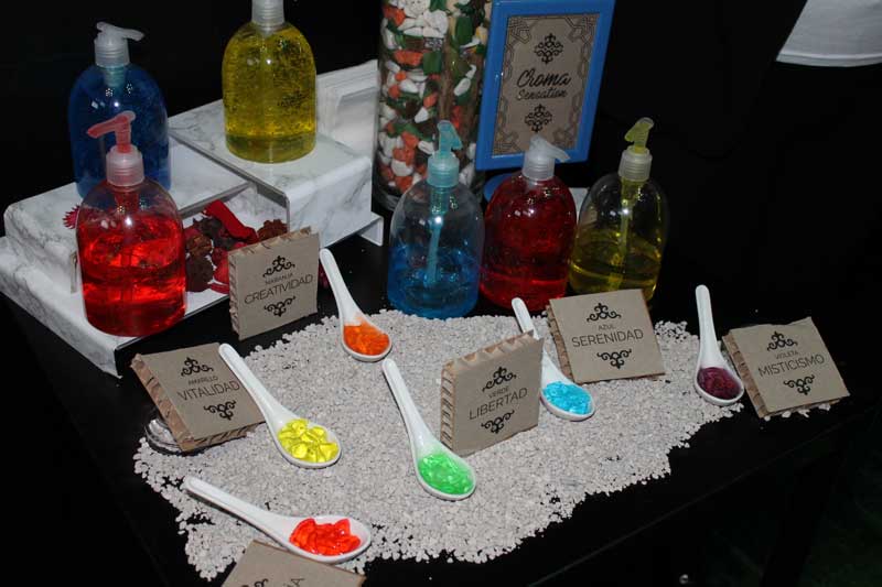 Como novedad, al público le esperaba una sorpresa, organizada por el equipo de Ten Image, antes de acceder a la sala donde tendría lugar el evento. Tres corners dedicados a la cosmética -Scrub, Croma y Aroma Sensation-, donde se podían probar productos como el peeling de sal y almendras, diversos geles cromáticos y los aceites esenciales de la gama de aromaterapia capaz de transportar a los asistentes a los looks Oasia.