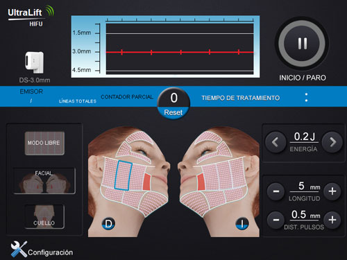 Para ello el equipo dispone de tres transductores diferenciados: el primero trabaja a 10 Mhz, logrando un punto focal a 1,5 mm de profundidad, cuya indicación principal será la mejora a nivel epidérmico; el segundo trabaja a 8 Mhz, disponiendo de un punto focal a 3 mm que incide sobre dermis profunda. Por último, el transductor más profundo trabaja a 4 Mhz y es capaz de focalizar la energía a 4,5 mm, a nivel del SMAS facial.