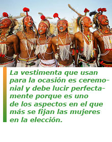 La vestimenta que usan para la ocasión es ceremonial y debe lucir perfectamente porque es uno de los aspectos en el que más se fijan las mujeres en la elección. Uno de sus complementos habituales es un turbante o diadema de algodón rematado con una pluma de avestruz.