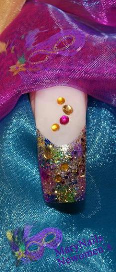 todo es practicar y practicar... pero si aplicas un poquito de gel despues de secar la base en la lámpara y hacer la almendra, y colocas el polvo de purpira con suaves golpecitos, lo esparces sin arrastrar(para no dejar los huecos), secas,. aplicas constructor , secas y limas hasta dejar bien fina la superficie... después aplicas strass y sellado. También puedes aplicar la purpurina mezclada con el gel pero si no tienes practica te quedaran muchos huecos...
