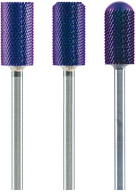 ➔ Cylindrical shapes/Formas cilíndricas: se trata de cortadores de metal duro, con dientes escalonados. La punta está caracterizada por una capacidad de carga y de vida útil muy elevada. La fresa, destinada al uso profesional, garantiza la eliminación de gel y rellenos de acrílico. Posibilita también acortar, eficientemente, las extensiones de uñas artificiales. Y actúa en la eliminación de callos, tanto en seco como en mojado.