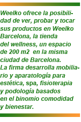 Weelko desarrolla mobiliario y aparatología para estética, spa, fisioterapia y podología basados en el binomio comodidad y bienestar. Dispone de un catálogo con más de un centenar de productos profesionales y específicos pensados para trabajar de una forma más agradable, y en estos momentos ya cuenta con 300 distribuidores en todo el mundo. Aunque su presencia en España es reciente, tiene una experiencia de casi 20 años en el sector trabajando a nivel internacional.