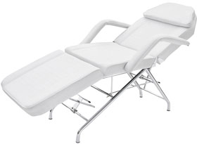Camilla fija de 3 cuerpos. Regula de forma independiente la inclinación del respaldo y del reposapiés. Brazos y cojín reposacabezas extraíbles. Agujero facial. Estructura metálica cromada y tapizado blanco en PVC de gran calidad y fácil limpieza.