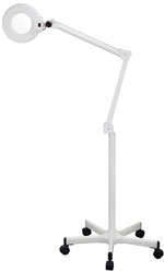 Lámpara con fluorescente de luz fría con lupa de 3 aumentos. Su brazo articulado facilita el movimiento. Dotada con base de 5 ruedas de máxima estabilidad.