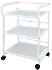 Carrito de estructura metálica en color blanco de diseño minimalista. Equipado con 3 amplios estantes. Total movilidad gracias a sus cuatro ruedas y barra