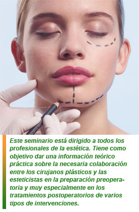 Este seminario está dirigido a todos los profesionales de la estética. Tiene como objetivo dar una información teórico práctica sobre la necesaria colaboración entre los cirujanos plásticos y las esteticistas en la preparación preoperatoria y muy especialmente en los tratamientos postoperatorios de varios tipos de intervenciones.