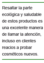 Muchos empresarios se decantan siempre por los productos químicos por resultar más baratos, pero no tiene porqué ser así siempre a la larga. No todos los cosméticos naturales son más caros, pero incluso aquellos que lo son pueden recibir una buena respuesta y recuperar con creces la inversión si la promoción es la adecuada. Resaltar la parte ecológica y saludable de estos productos es una excelente manera de llamar la atención, incluso en clientes reacios a probar cosméticos nuevos.