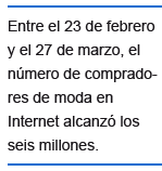 Internet gana posiciones dentro del sector de la moda y capta a un mayor número de compradores. Entre el 23 de febrero y el 27 de marzo, el número de compradores de moda en Internet alcanzó los seis millones, según Kantar Worldpanel. Por lo tanto, se ha registrado un millón de clientes más, comparado con el mismo periodo del año pasado.
