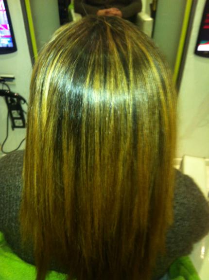 Se seca con el secador, realizando Brushing y se plancha cada mechón de 12 a 15 veces, con presión firme en la extensión del mechón..(230º), donde estaba dañado 5 o 6 veces mas rápido. Mechoncitos finos y bien planchados a conciencia(jeje Ade aquí si soy reiterativa) Y se acabó.